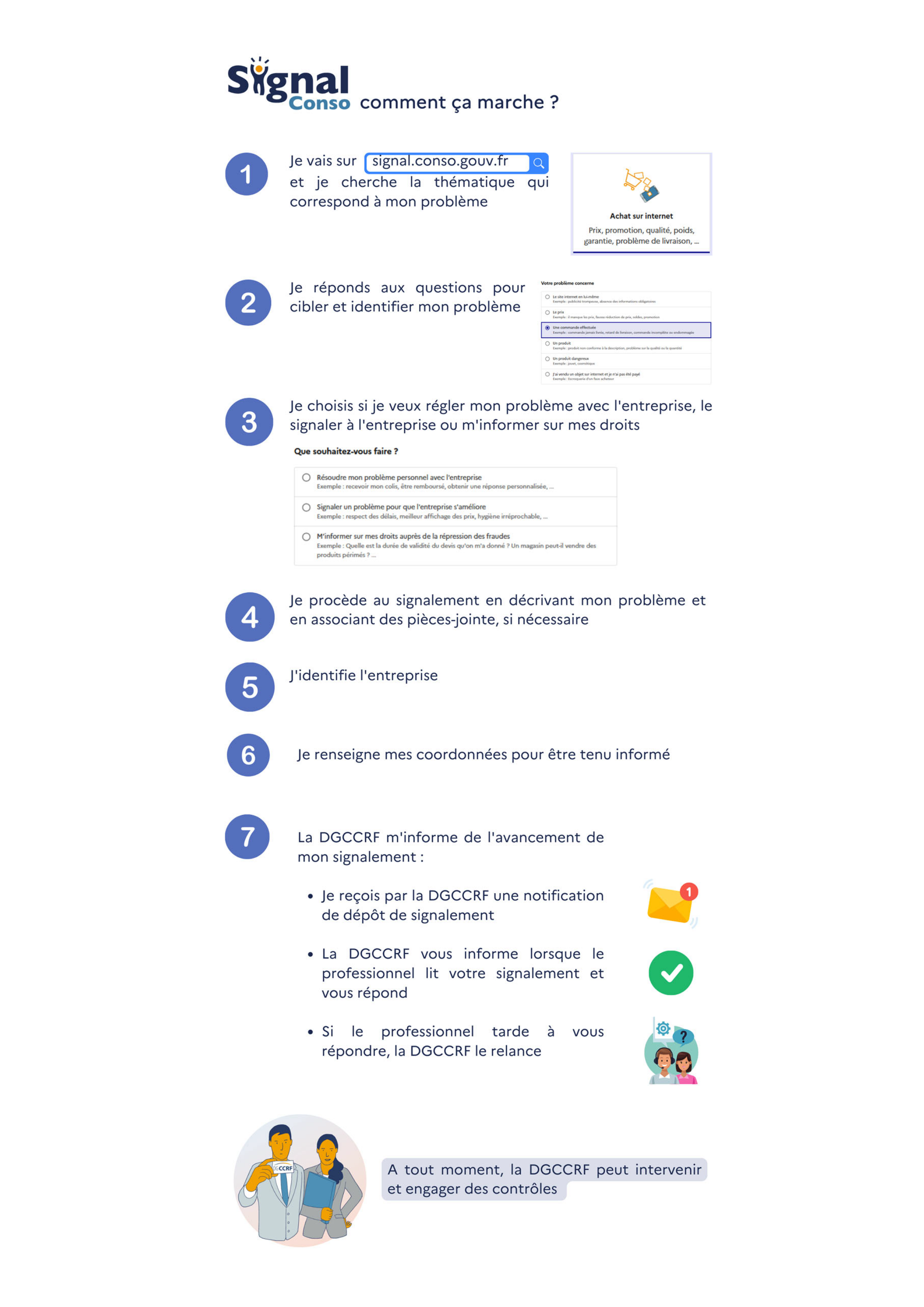 SignalConso permet aux consommateurs de saisir un professionnel pour rechercher une solution à l’amiable avec lui. C’est aussi un outil de ciblage pour les agents de la DGCCRF. L’outil permet de repérer un problème émergent, une alerte ou les professionnels qui font l’objet de beaucoup de signalements. Selon le nombre de problèmes, leur gravité ou la qualité des réponses apportées par le professionnel, les agents de la DGCCRF peuvent engager un contrôle, voire une enquête.
