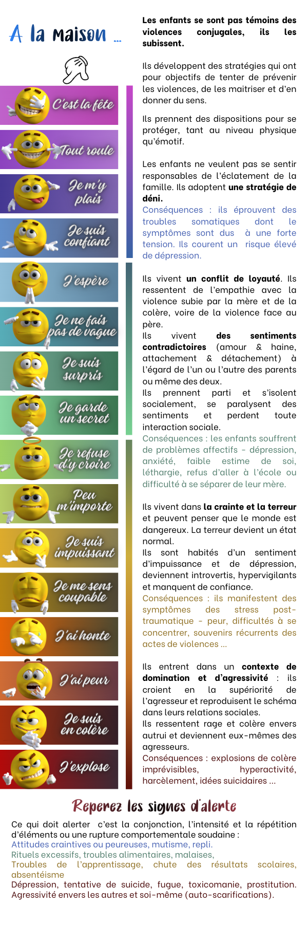Dans tous les cas de violences conjugales, l’enfant est victime de violence psychologique grave. Qu’ils assistent ou non aux actes de violence, les enfants sont toujours affectés par le climat qu’engendre la violence. L’enfant voit que quelqu’un qu’il aime (sa mère) est victime de violences de la part d’une autre personne qu’il aime (son père). Les violences dans le couple ne sont pas une « simple » histoire de passage à l’acte violent et isolé, c’est au contraire un contexte permanent de peur, d’anxiété et d’insécurité pour l’enfant.